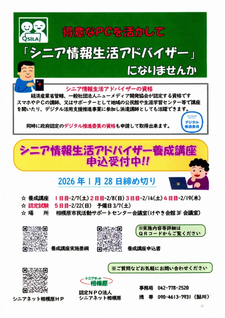2025年12月16日 / 最終更新日時 : 2025年12月16日 snsagami 講座 シニア情報生活アドバイザー養成講座 シニア情報生活アドバイザー養成講座募集が始まりました。詳細は下記サイトをhttps://www.snsagami.org/jigyo/shiniajyohosikaku/siniajyoho2 FacebookXBlueskyHatenaCopy